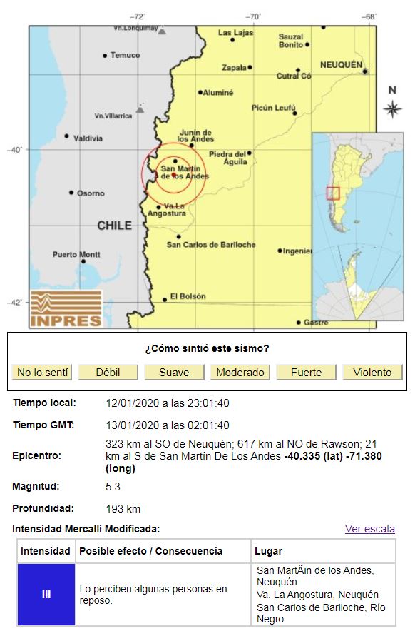 Un fuerte sismo se registró anoche en San Martín de los Andes. Según el Instituto Nacional de Prevención Sísmica (Inpres), el temblor fue percibido por algunos vecinos "en reposo", tanto de la localidad como de Villa la Angostura y Bariloche.