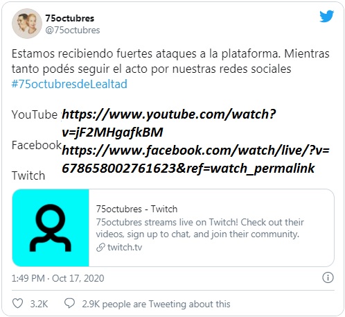 "Estamos recibiendo fuertes ataques a la plataforma. Mientras tanto podés seguir el acto por nuestras redes sociales #75octubresdeLealtad", informaron los organizadores desde la cuenta oficial que el sitio posee en Twitter.