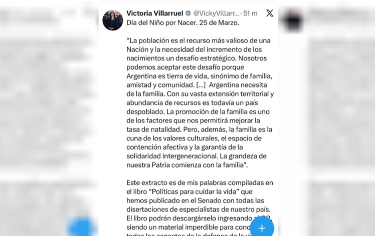 La vicepresidenta Victoria Villarruel conemoró este miércoles el Día del Niño por Nacer y destacó la importancia de “la defensa de la vida”.
