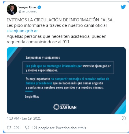 Durante la conferencia de prensa Uñac destacó que "después del terremoto de 1944 la Provincia viene trabajando con un código edilicio que ha permitido tener un alto porcentaje de su construcción sismorresistente y eso ha permitido soportar de una manera distinta habiendo sido de una magnitud parecida al terremoto de 1944, como también a 1977".