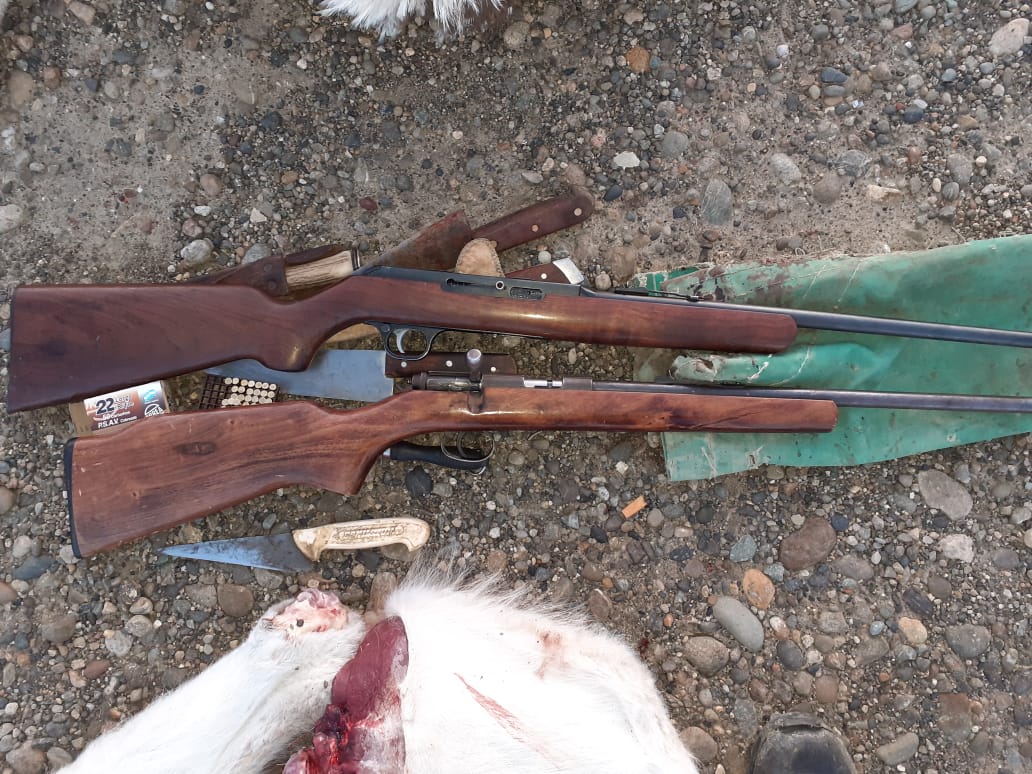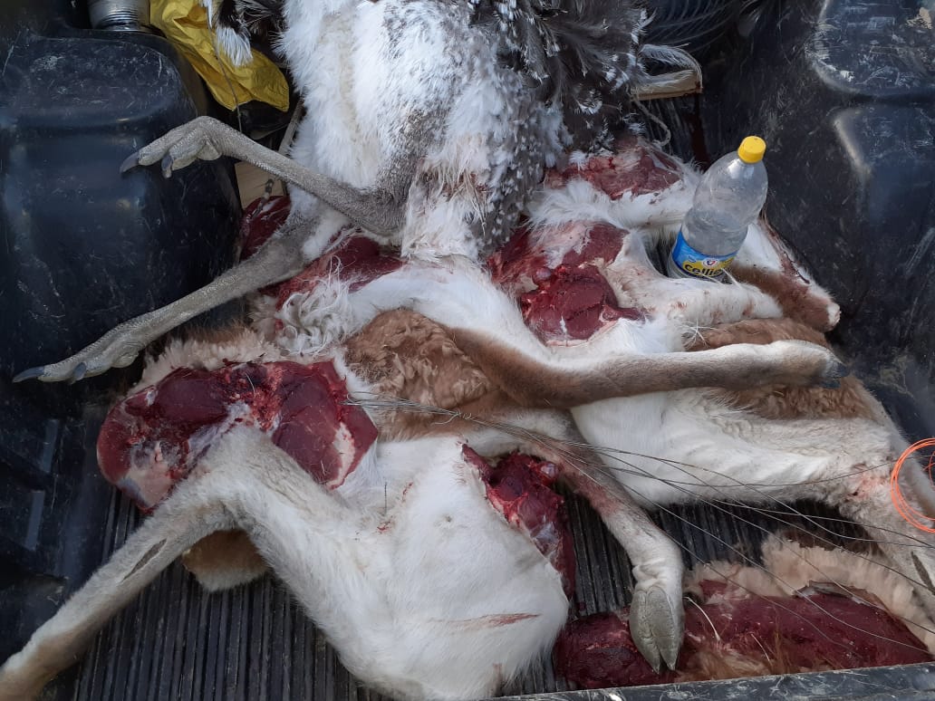 El informe policial indicó que dentro de la camioneta había: “dos rifles calibre 22 con cargadores, cincuenta municiones calibre 22, cinco armas blancas (cuchillos), una chaira; sobre la caja de carga un avestruz, y trozos de guanacos, contabilizando 4 cuartos traseros, 4 paletas y 4 lomos”, todo ello fue secuestrado.