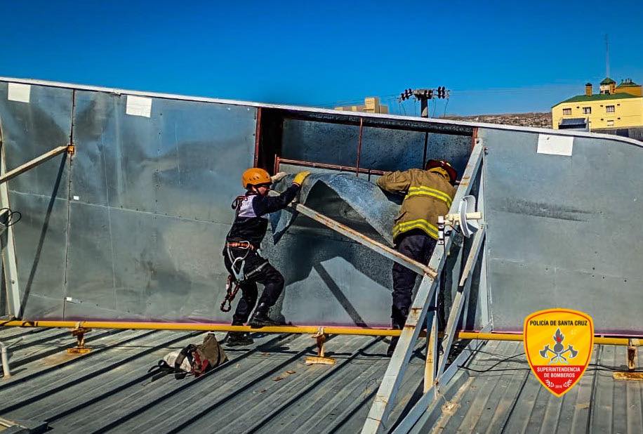 En Caleta Olivia, la División Cuartel 5° del Departamento Zona II acudió al sector de Hipertehuelche tras el aviso de una chapa suelta en un cartel que representaba un peligro por la acción del viento. La dotación, con 6 efectivos a bordo de los móviles PRIO 819 (Autobomba) y PRIO 996 (Rescate), desplegó una escalera de dos tramos y procedió a doblar y anclar la chapa con alambre y tenaza, neutralizando el riesgo de voladura sobre la vía pública.