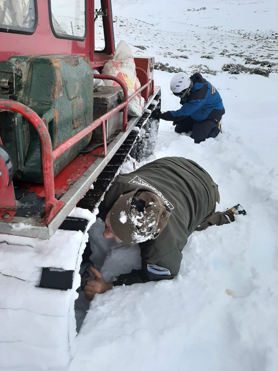 Posteriormente, ayer para ser más precisos, siendo a las 06.30 horas nuevamente se dispone realizar el rescate en forma conjunta con personal del Escuadrón 39 de Perito Moreno, integrantes del Escuadrón 43 de Río Turbio y 42 de Calafate con personal del grupo GEAM de GN para apoyar el operativo de rescate con dos motonieves y un SNOW TRAC, personal del hospital Dr. “Oscar H. Natale”, entre ellos una obstetra y medios de la agencia de vialidad provincial de Santa Cruz, Delegación Perito Moreno. Estos últimos efectuaron los traslados de los equipos.