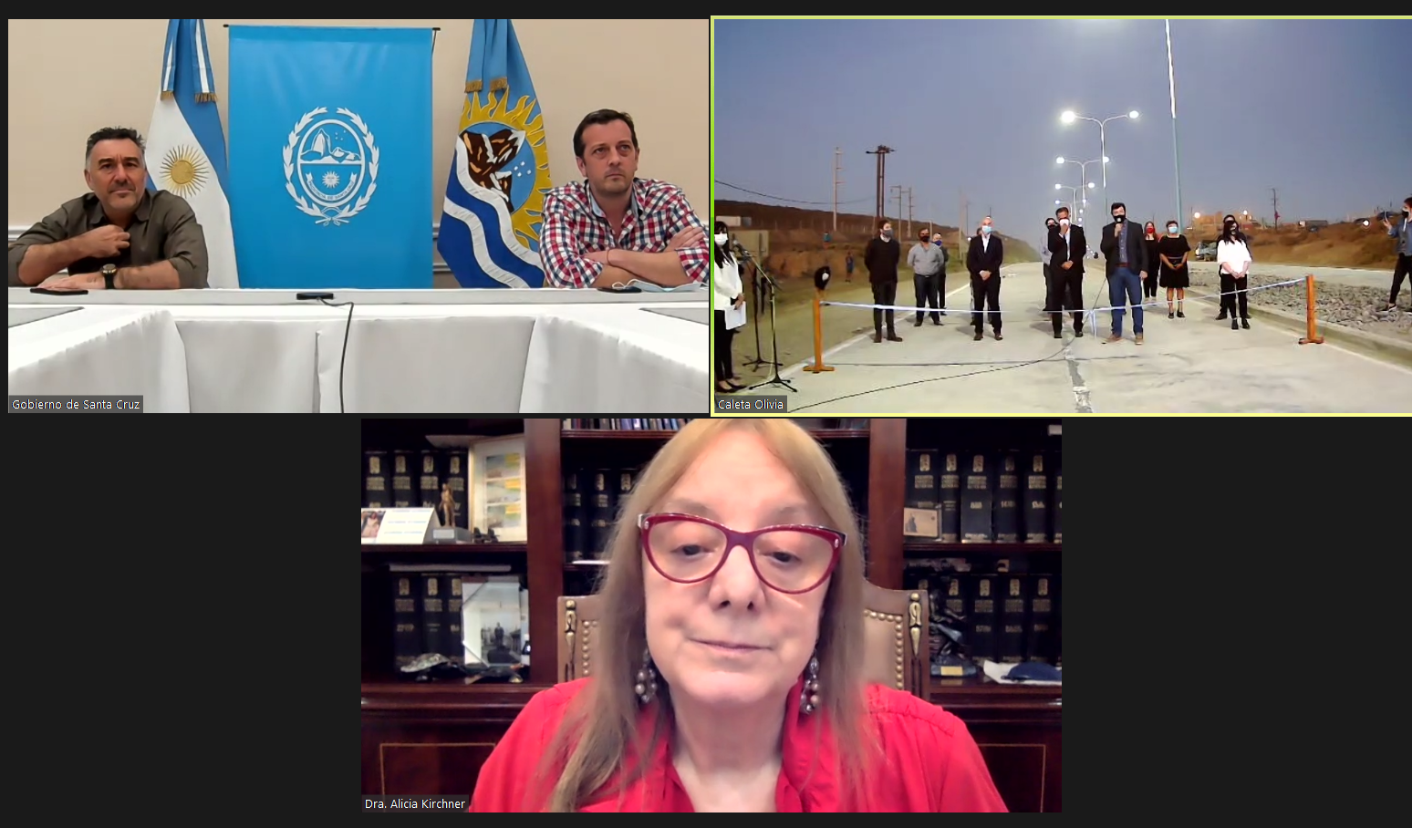 La gobernadora Alicia Kirchner estuvo presente, a través de videoconferencia, en la inauguración del tramo Cañadón Seco – Caleta Olivia de esta ruta construida con fondos provinciales por Vialidad Provincial y Servicios Públicos SE que trabajó en la colocación de las luminarias.