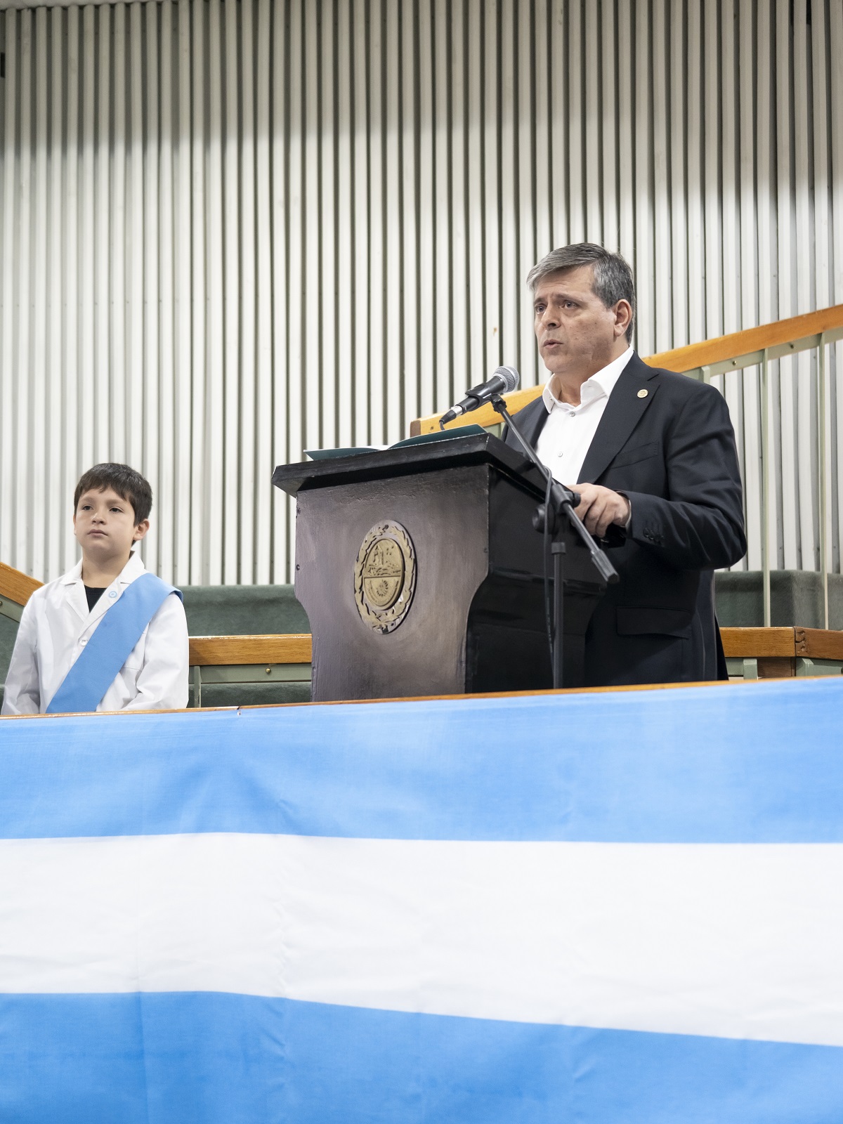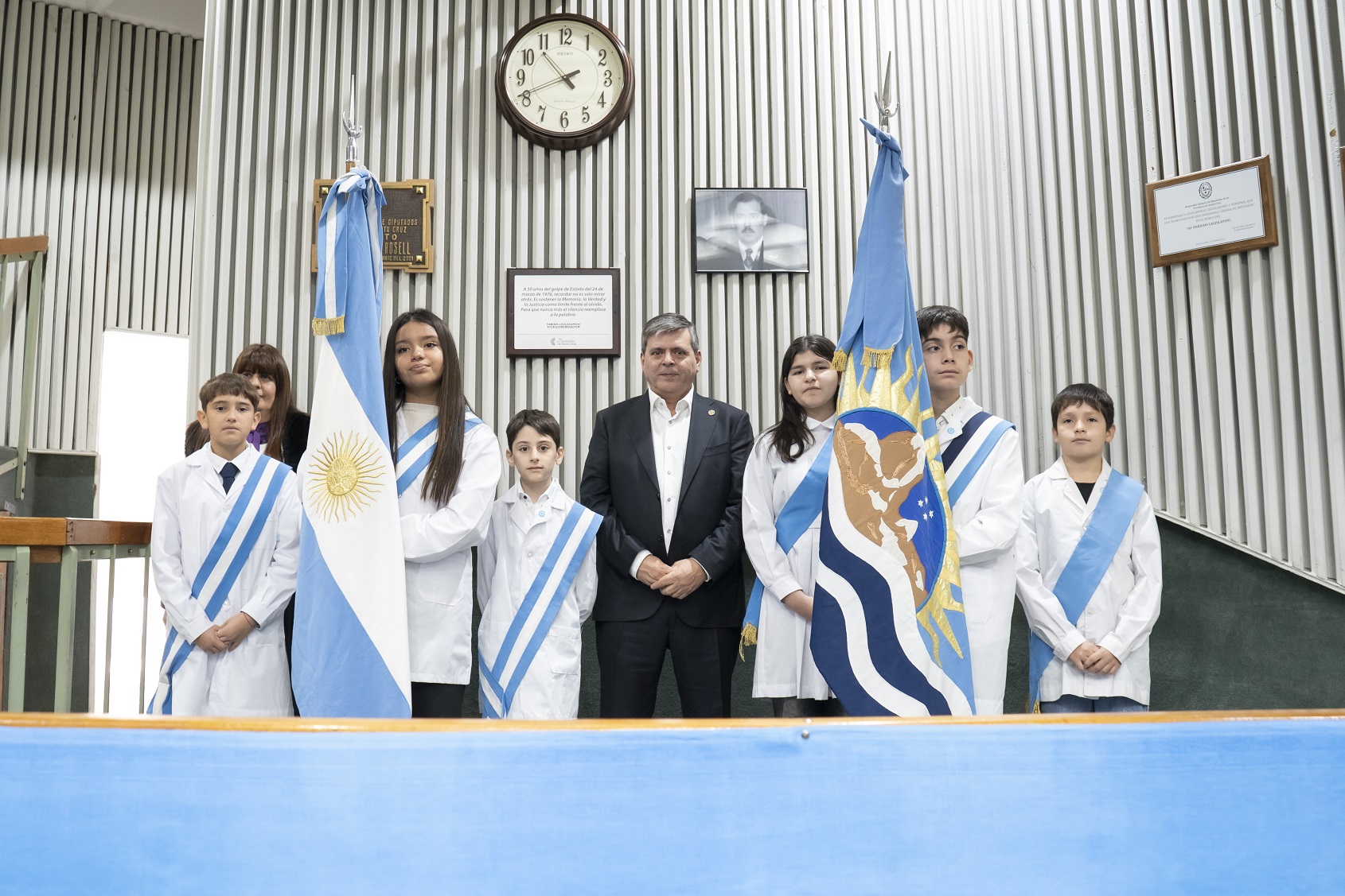 En primer lugar, los presentes recibieron de pie a los alumnos de 7°, 6° y 5° grado de la Escuela Primaria Provincial N° 1 “Hernando de Magallanes”, quienes ingresaron al recinto portando la Bandera Nacional Argentina y la bandera de la provincia de Santa Cruz. Luego entonaron las estrofas de Himno Nacional Argentino, en una versión interpretada por artistas santacruceños.