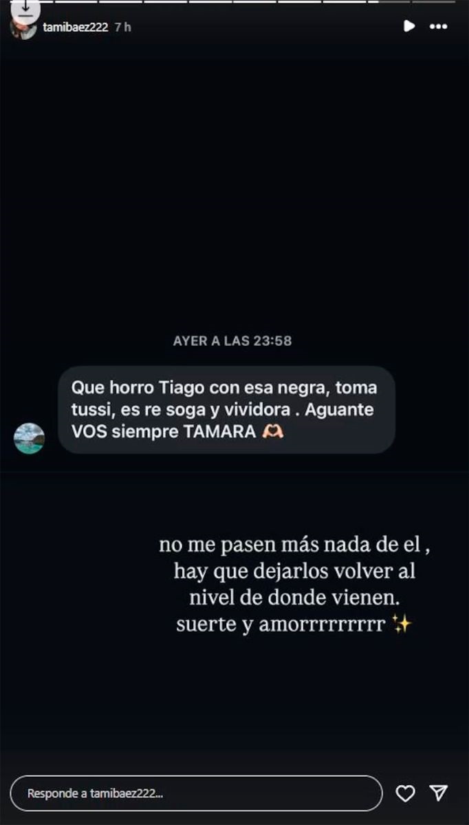 A mediados de agosto, tras anunciar de manera directa que está sola y prefiere focalizar sus energías en su familia, Tamara ventiló que Thiago Martínez la engañó. Para eso, publicó un mensaje que le mandó una seguidora.