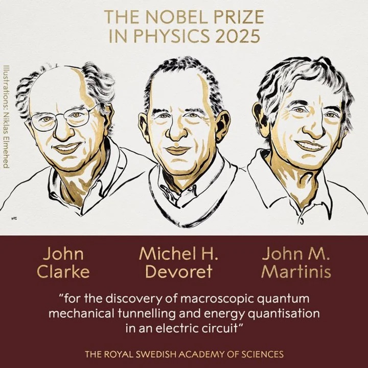El premio Nobel de Física 2025 fue otorgado este martes a John Clarke, Michel H. Devoret y John M. Martinis "por el descubrimiento del efecto túnel cuántico macroscópico y la cuantización de la energía en un circuito eléctrico”.