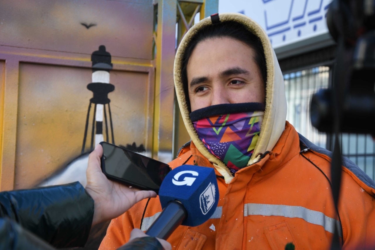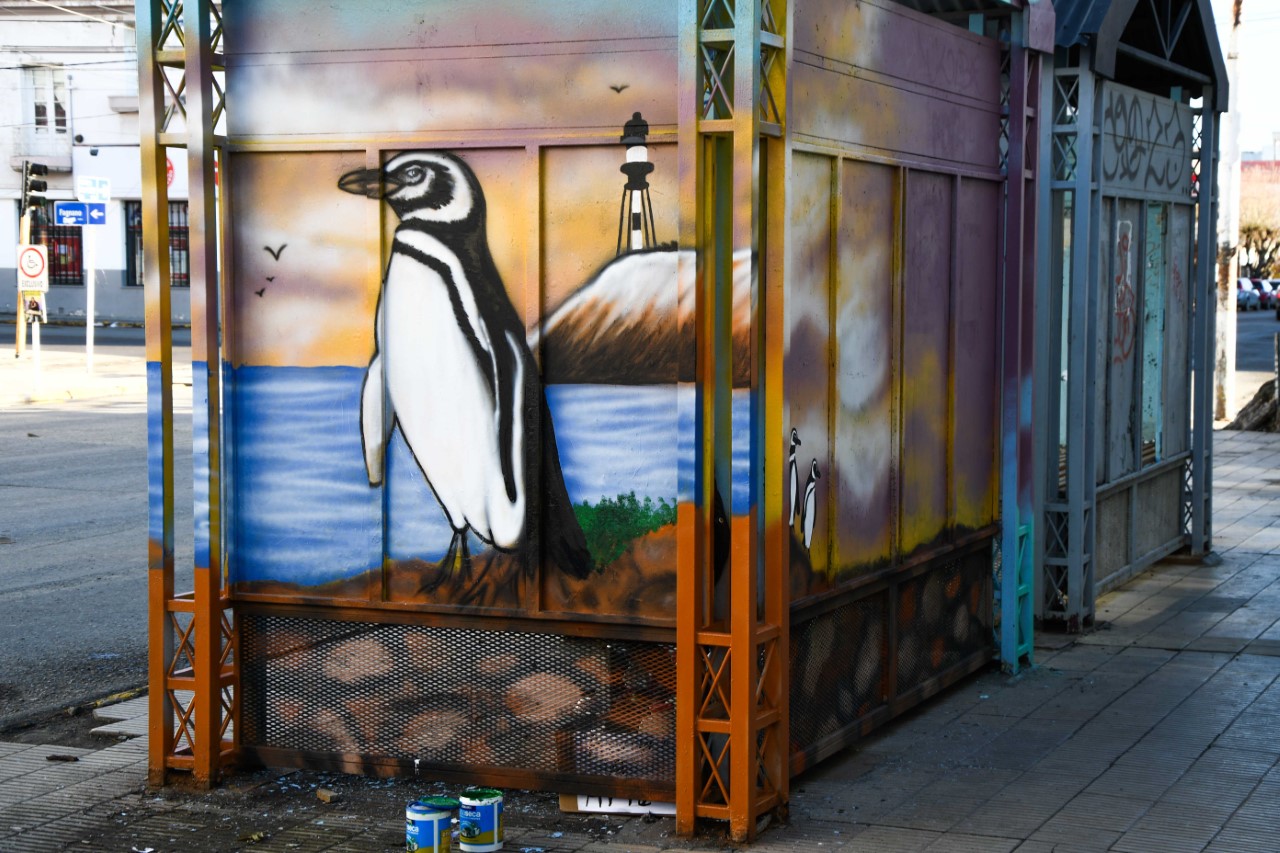 Jonathan, artista que ya ha realizado diversos murales en nuestra ciudad comentó que “hoy estamos trabajando en la garita, si el clima nos permite ya que por el frío se complica el uso de las pistolas” y explicó que “todo lo que es aerografía, los compresores y todo ese tipo de máquina el frío provoca congelamiento adentro del equipo y no se puede usar”. Por ese motivo durante la mañana se abocaron a “realizar lo que es la base y luego esperar a que mejore un poco el clima” para utilizar los equipos. En la mencionada garita se realizó un diseño de pingüinos.