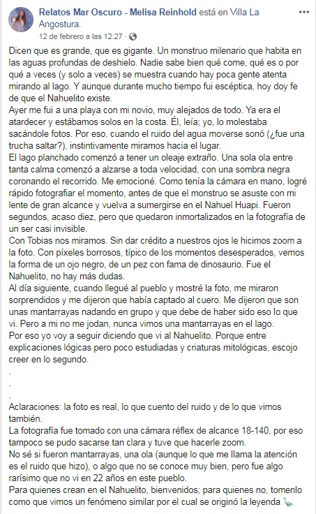 La periodista contó que un sonido les llamó la atención, por lo que dirigieron su vista al lago, donde observaron una ola, la única sobre el agua tranquila. Fueron 10 segundos, pero Reinhold logró capturar el momento: "como tenía la cámara en mano, logré rápido fotografiar el momento, antes de que el monstruo se asuste con mi lente de gran alcance y vuelva a sumergirse en el Nahuel Huapi".