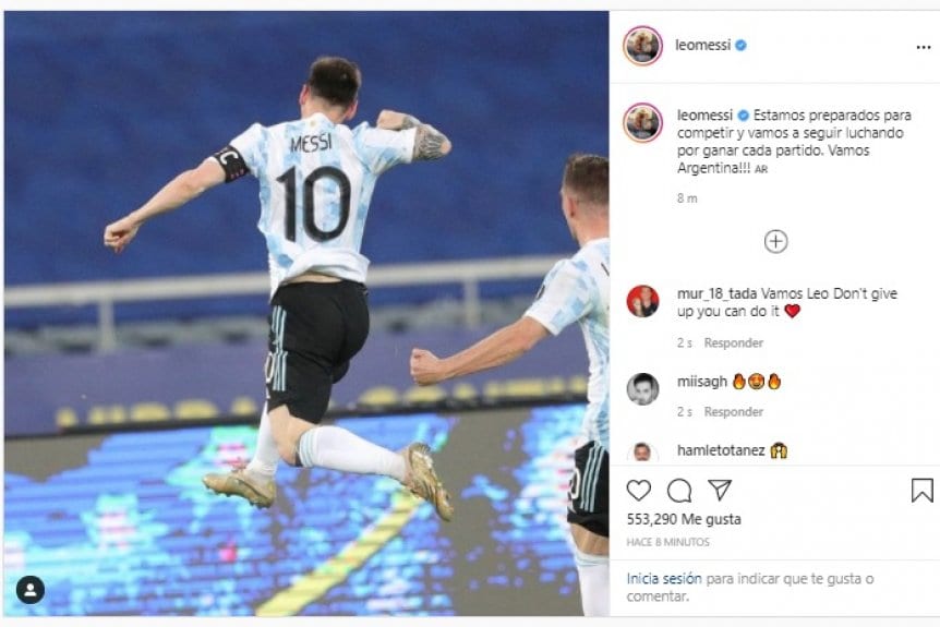 Lionel Messi realizó una publicación en su cuenta de Instagram. “Estamos preparados para competir y vamos a seguir luchando para ganar cada partido. ¡Vamos Argentina!”, escribió junto a una foto suya en el festejo del gol de la Selección a Chile por la Copa América.