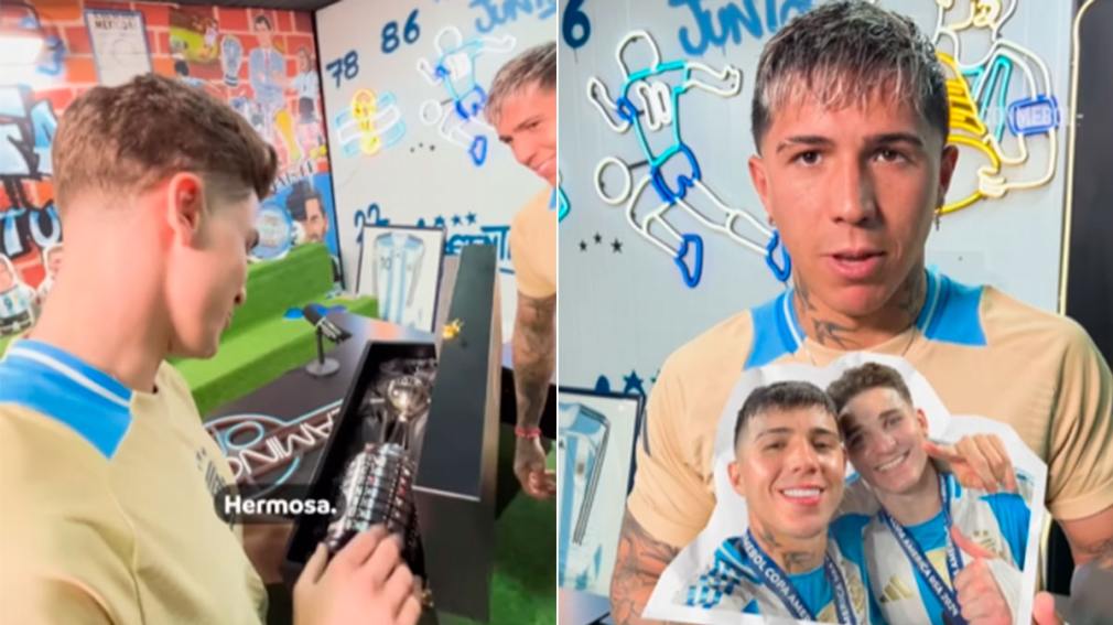 Más adelante, fue el turno de Julián Álvarez, quien recibió una réplica de la Copa Libertadores 2018, entregada por el propio Enzo. “Una locura, Madrid -sede de la final-. ¿Te acordás, no?”, le dijo Fernández en referencia a la recordada final en el estadio Santiago Bernabéu ante Boca Juniors.