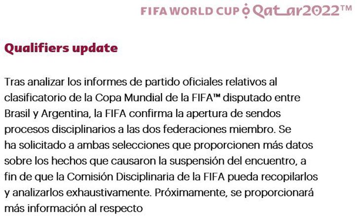 "Tras analizar los informes de partido oficiales relativos al clasificatorio de la Copa Mundial de la FIFA disputado entre Brasil y Argentina, la FIFA confirma la apertura de sendos procesos disciplinarios a las dos federaciones miembro", ratificaron en un comunicado.
