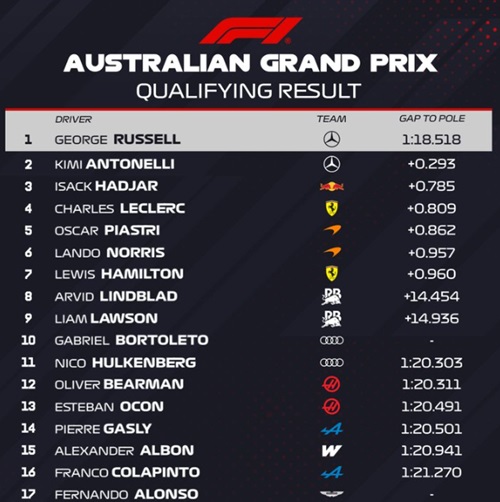 George Russell fue el más rápido en la clasificación y con el Mercedes no solo ratificó el rendimiento del F1 W17 durante la última práctica, sino que además encabezó el «1-2» de la sesión al ser escoltado por Kimi Antonelli quien pudo salir a girar tras el encomiable trabajo de los mecánicos e ingenieros que repararon su coche tras el fuerte despiste en la última y golpe que dañó varias piezas que debieron ser reemplazadas para esta tanda.