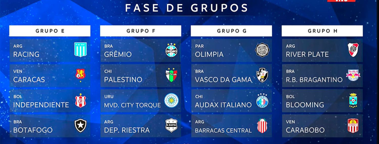 Racing fue el primer elenco nacional en ser sorteado al encabezar el grupo E, uno de los más complejos al medirse con Caracas (Venezuela), Independiente Petrolero (Bolivia, en la altura de Sucre) y Botafogo (Brasil), en una revancha de la Recopa Sudamericana. River apareció como cabeza de serie del grupo H, en cual se verá las caras con Bragantino (Brasil), Blooming (Bolivia) y Carabobo (Venezuela).