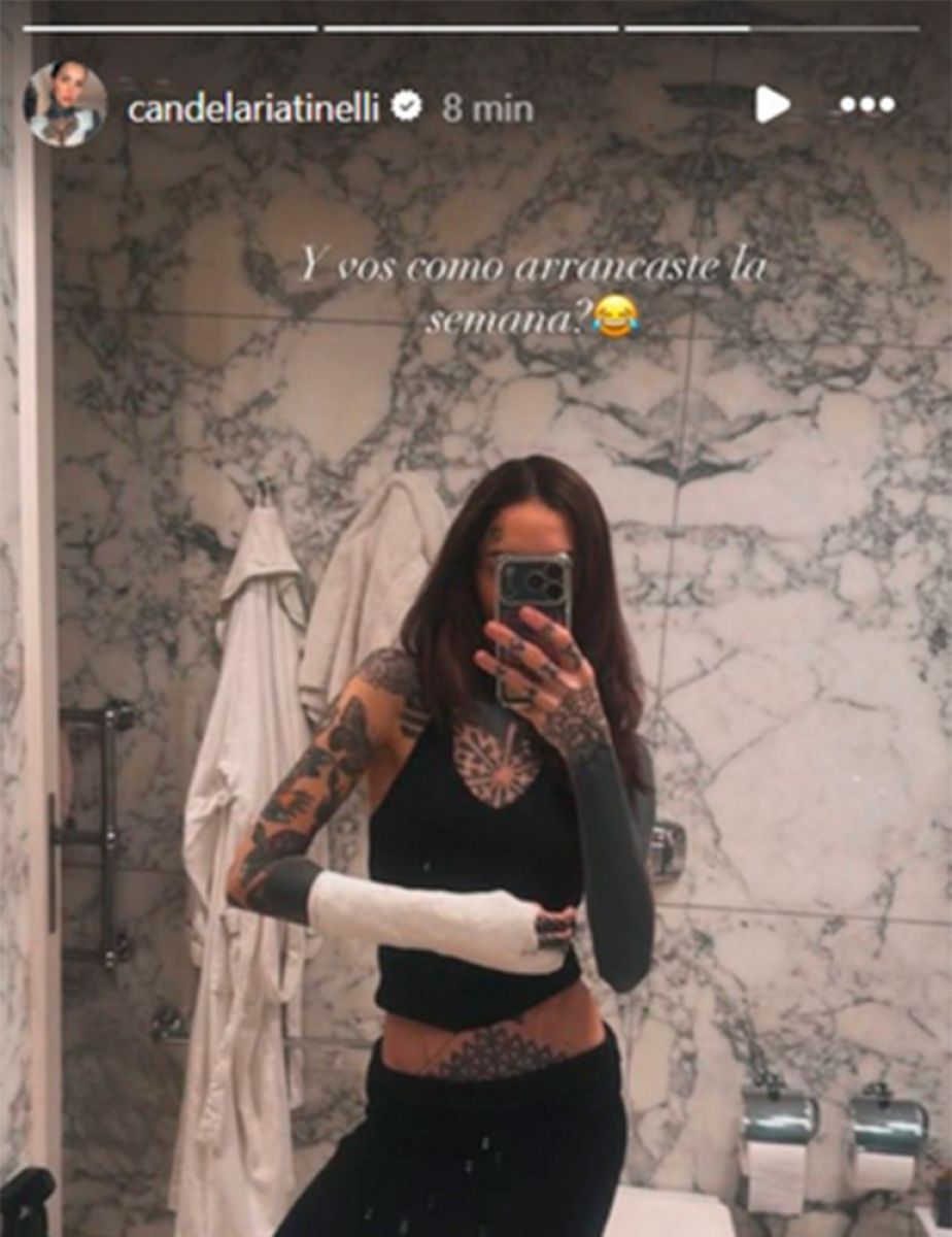 Cande Tinelli, por su parte, confirmó la noticia a través de sus historias de Instagram, donde publicó una foto con el brazo enyesado.