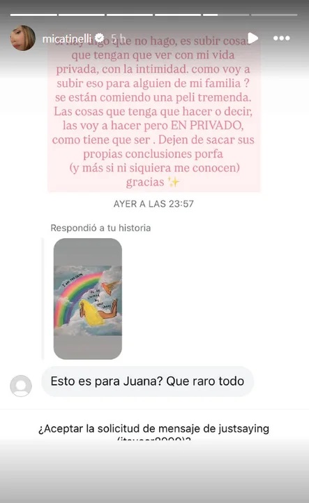 Sin embargo, Mica utilizó sus redes para aclarar la situación y desmintió que se trate algo vinculado con Juanita.