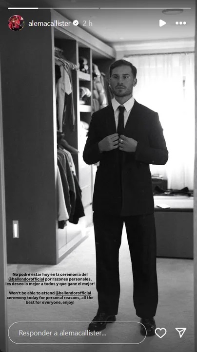 “No podré estar hoy en la ceremonia del @ballondorofficial por razones personales, les deseo lo mejor a todos y que gane el mejor!”, escribió el futbolista en sus historias de Instagram.