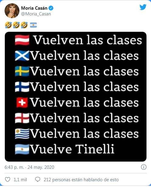 La imagen en cuestión muestra las banderas de distintos países junto a la frase "vuelven las clases", y por último aparece la bandera argentina y un "vuelve Tinelli".