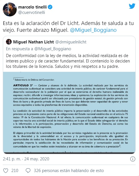 Aunque todavía el conductor no se expidió al respecto, sí le contestó al economista Miguel Ángel Boggiano, que realizó una comparación similar: "La justicia no es una actividad esencial, pero Tinelli sí. Cerremos el país".