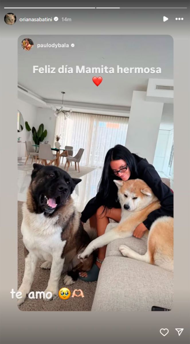 Por primera vez recibió el saludo de su pareja en una fecha especial, momento que ella eligió compartir en redes sociales con el mismo amor con el que viene atravesando la gestación. El encargado de sorprenderla fue Paulo, quien le dedicó una publicación tierna y directa en sus stories: una foto donde se la vio a la artista junto a sus dos perros, Kaia y Bowen, con una de las mascotas acurrucada en los brazos de ella. “Feliz día, mamita hermosa”, escribió el delantero de la Roma, acompañando el mensaje con una imagen que habla de hogar, familia y la felicidad inmensa por la llegada de su hija.