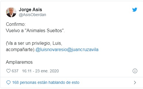 El propio Novaresio quiso deslizar esta mañana que las negociaciones con Asís estaban encaminadas: "#animalessueltos2020 ¿Jorge Asís mano a mano, sin filtro, con TODA la información, todas las semanas?".