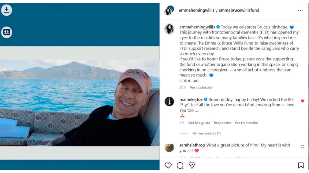 “Hoy celebramos el cumpleaños de Bruce. Esta experiencia con la demencia frontotemporal me abrió los ojos a la realidad que afrontan tantas familias. Fue lo que me inspiró a crear la Fundación Emma y Bruce Willis para generar conciencia sobre la enfermedad, apoyar la investigación y brindar apoyo a los cuidadores que cargan con tanto peso cada día”, escribió.
