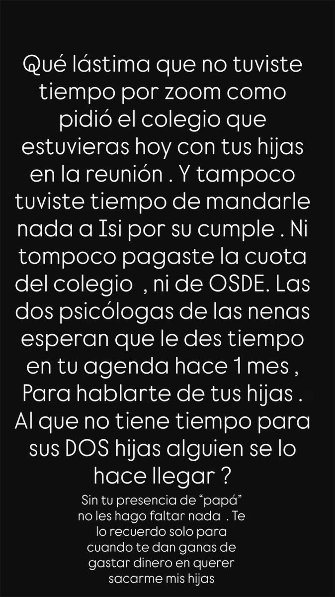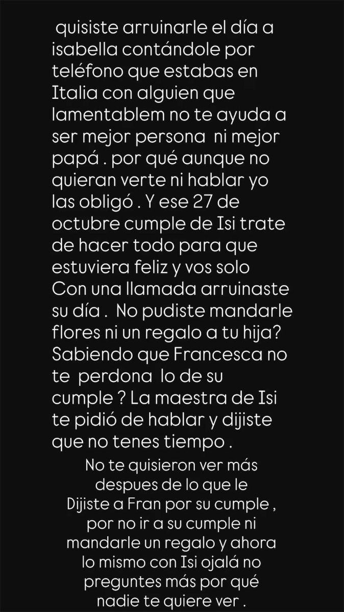 Minutos más tarde de esta primera historia llegó una segunda, aún más contundente y tajante. “Quisiste arruinarle el día a Isabella contándole por teléfono que estabas en Italia con alguien que lamentablemente no te ayuda a ser mejor persona ni mejor papa”, escribió apuntando directamente contra la China, a quien en más de una ocasión la atacó sin nombrarla.