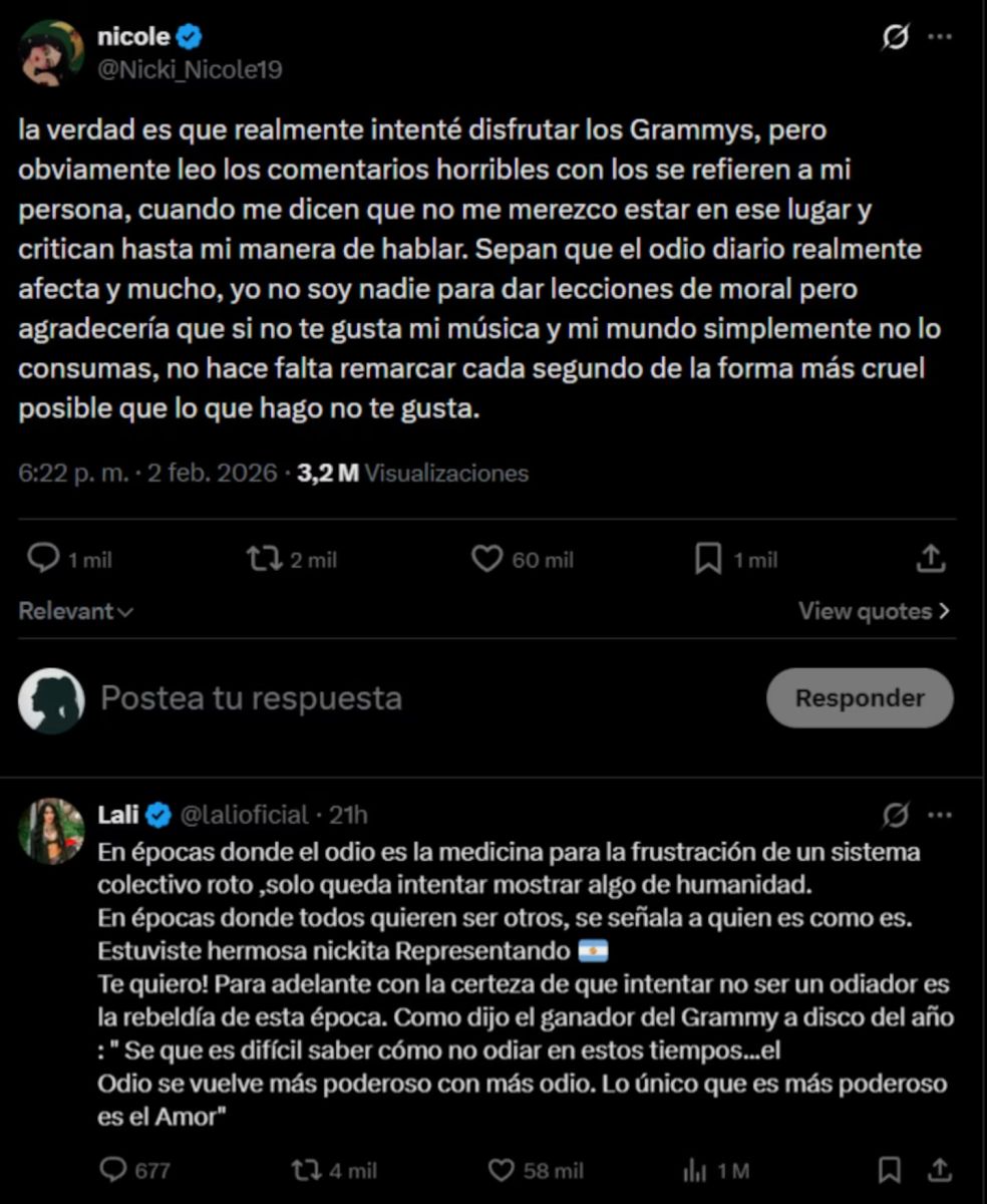 Nicki Nicole compitió en la categoría Mejor álbum de música urbana, junto a artistas como Fito Páez, CA7RIEL & Paco Amoroso y Trueno, aunque finalmente no obtuvo el galardón. Sin embargo, su presencia en la ceremonia generó una catarata de comentarios negativos, lo que motivó la reacción de Lali.