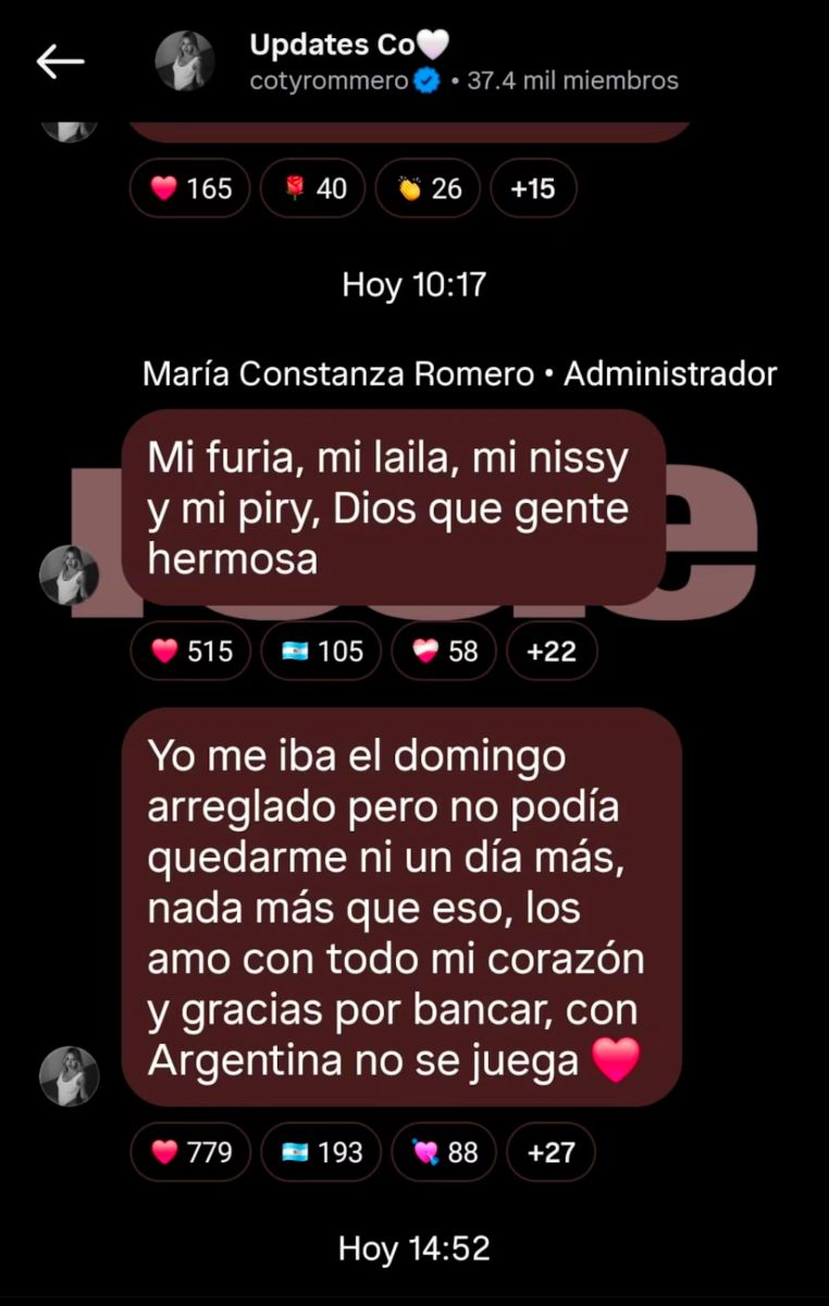 En ese mismo descargo, dejó entrever que su participación tenía un trasfondo previo. “Yo me iba el domingo arreglado, pero no podía quedarme ni un día más. Nada más que eso. Los amo con todo mi corazón y gracias por bancar. Con la Argentina no se juega”, agregó, sin dar mayores detalles sobre lo ocurrido.