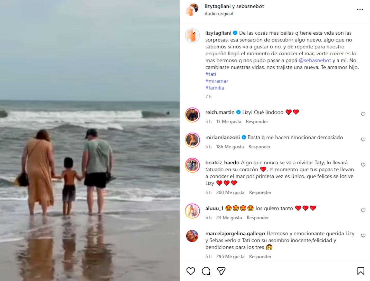 Acto seguido, expresó: “De repente para nuestro pequeño llegó el momento de conocer el mar, verte crecer es lo más hermoso que nos pudo pasar a papá y a mí”.