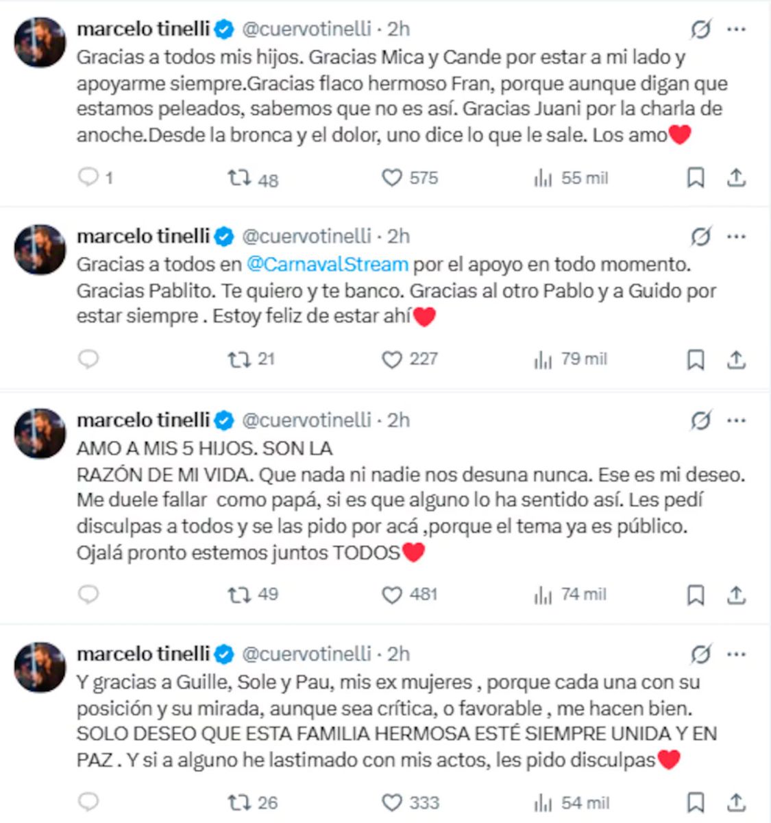 Marcelo Tinelli se hartó de los trascendidos y rompió el silencio a través de su cuenta de X. Allí se refirió a su situación personal y familiar, la deuda de su empresa y las amenazas que recibe su familia. Además, sorprendió al hacer un mea culpa en el que reflexionó sobre su rol de padre.