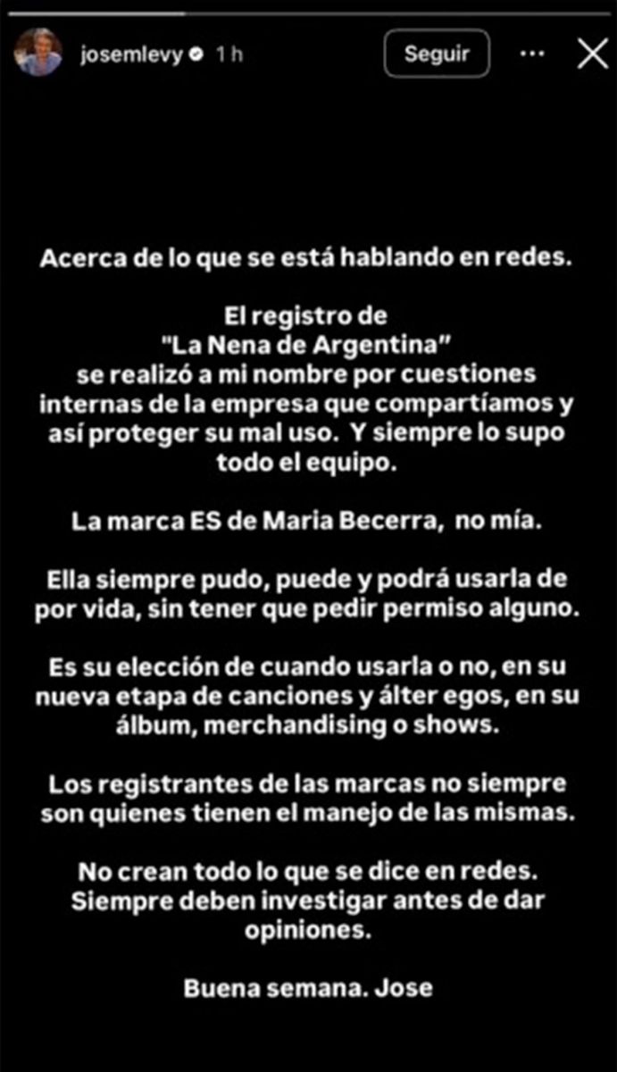En el mismo mensaje, el ex mánager fue enfático al sostener que la marca pertenece a María Becerra: