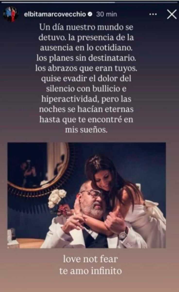 "Un día nuestro mundo se detuvo. La presencia de la ausencia en lo cotidiano. Los planes sin destinatario. Los abrazos que eran tuyos", escribió y acompañó la publicación con una foto del día de su casamiento con Lanata.