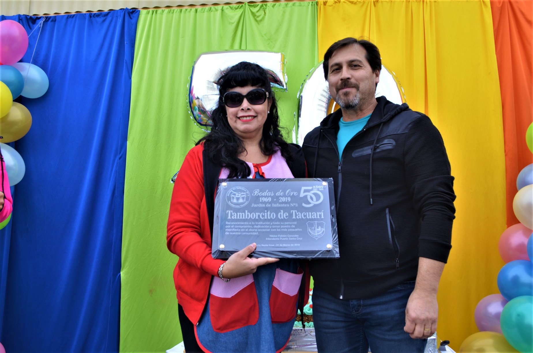 Entre los regalos que recibió el Tamborcito, el intendente Néstor González hizo entrega de una plaqueta conmemorativa que fue recibida por la directora del establecimiento prof. Carolina Puelman; se adquirieron juegos para el jardín y se entregó una copia del acta acuerdo, entre la Municipalidad de Puerto Santa Cruz y el IDUV, por la que se ampliarán y refaccionarán las instalaciones.