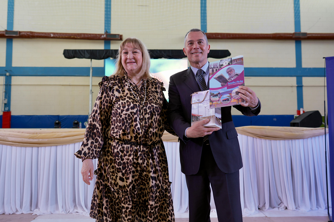 La celebración, que se desarrolló en el gimnasio El Tehuelche de Jaramillo, contó con la presencia del jefe de Gabinete de Ministros, Daniel Álvarez; el ministro de Energía y Minería, Jaime Álvarez; el presidente de Servicios Públicos Sociedad del Estado, Matías Cortijo; la senadora Natalia Gadano, la presidenta de la Comisión de Fomento Jaramillo y Fitz Roy, Ana María Urricelqui; jefes comunales; funcionarios provinciales y municipales; y vecinos y vecinas de ambas poblaciones santacruceñas.