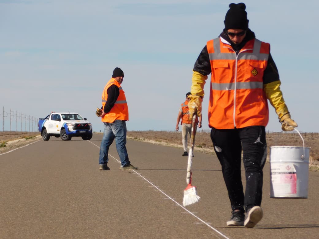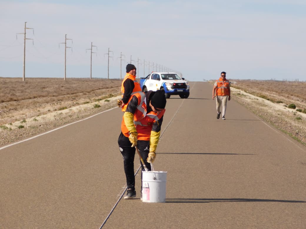 Los trabajos son ejecutados por personal del Distrito Vial Río Gallegos en coordinación con el Distrito Vial Puerto Deseado como etapa previa a la demarcación horizontal de eje y bordes laterales de la calzada.