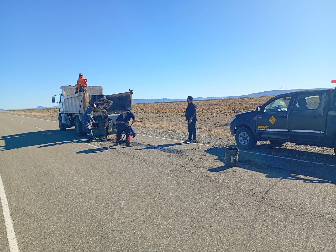 Personal del Distrito Vial Gobernador Gregores realiza tareas de bacheo en la Ruta Provincial N°27 y trabajos de mantenimiento y perfilado de banquinas en distintos tramos de la Ruta Nacional N°40, con el objetivo de mejorar la transitabilidad y la seguridad vial en la región.