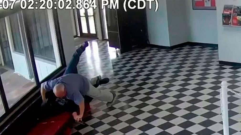 Las grabaciones difundidas muestran a Kirk Moore saliendo al encuentro de Victor Hawkins, quien entró al vestíbulo empuñando dos pistolas semiautomáticas presuntamente tomadas sin autorización a su padre.