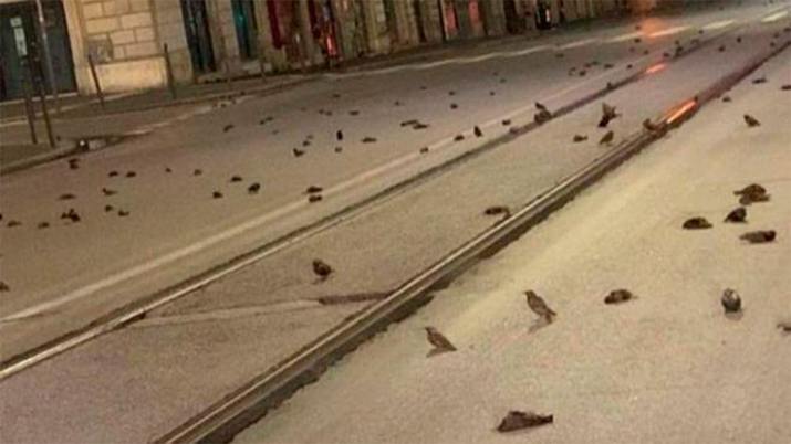 Las calles del centro de Roma se vieron cubiertas esta Nochevieja de cientos de pájaros muertos, caídos inmediatamente después de la medianoche. Los pájaros, en su mayoría estorninos, habrían muerto al parecer por paros cardiacos causados por los fuegos artificiales y petardos lanzados para recibir el año nuevo en la capital italiana,