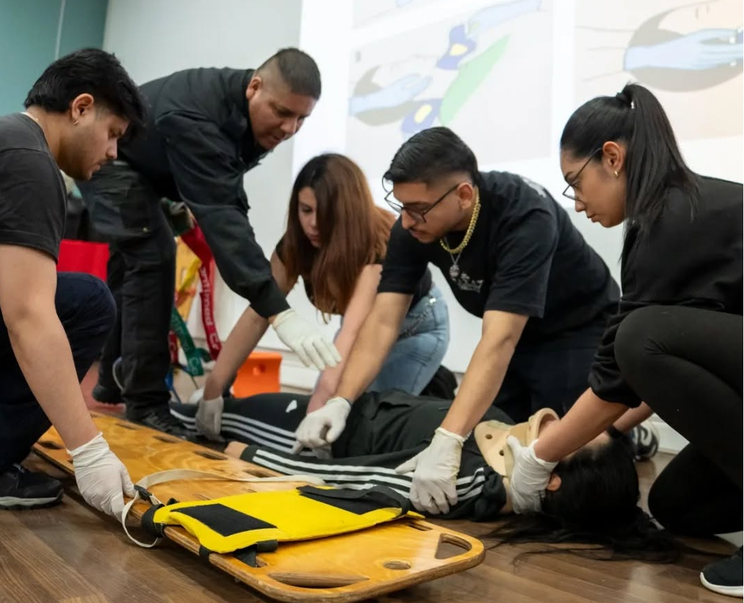 Los estudiantes realizaron prácticas con simuladores adultos y pediátricos, además de trabajar en maniobras de Heimlich, inmovilización con tabla rígida y reconocimiento de materiales de emergencia.