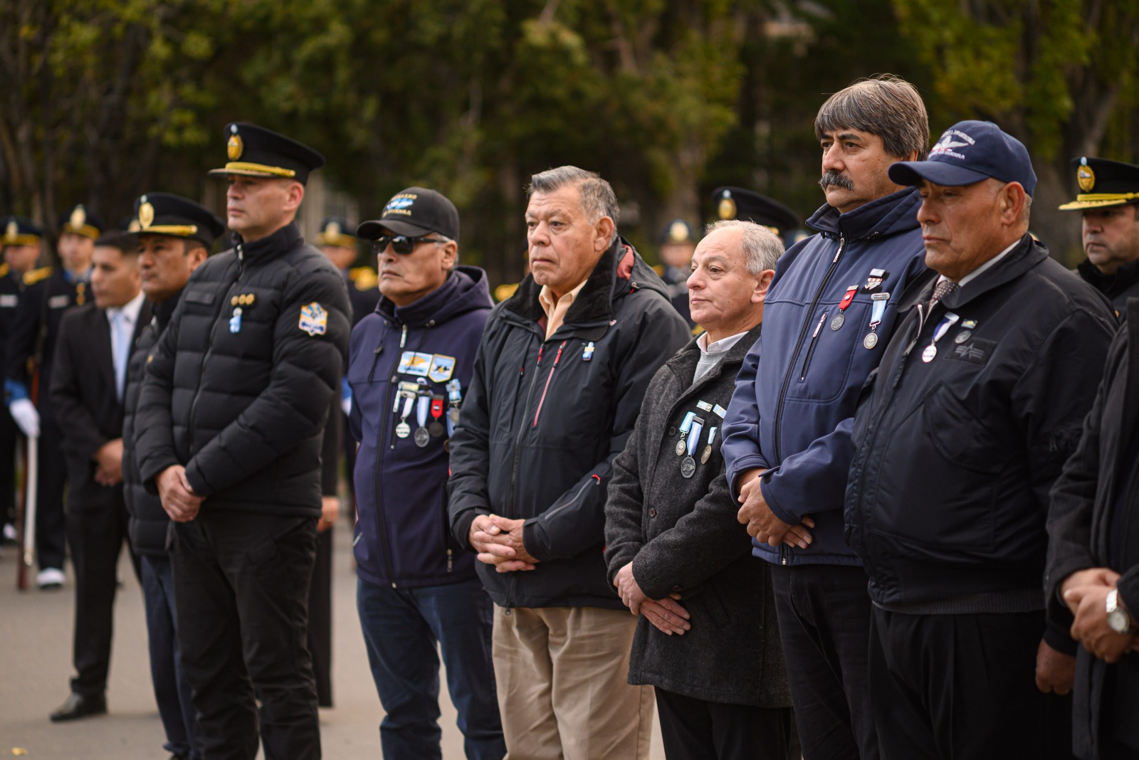 La ceremonia estuvo encabezada por el gobernador Claudio Vidal, acompañado por el jefe de Policía de la Provincia, comisario general Diego Agüero, y contó además con la presencia del jefe de Gabinete de Ministros, Pedro Luxen; integrantes del Poder Ejecutivo Provincial; autoridades de las fuerzas armadas y de seguridad; representantes del Servicio Penitenciario Provincial; y como invitados especiales los veteranos de guerra, entre ellos, miembros del Centro de Veteranos de Guerra de Malvinas “Soldado José Honorio Ortega” y de la Comisión Provincial de Malvinas.