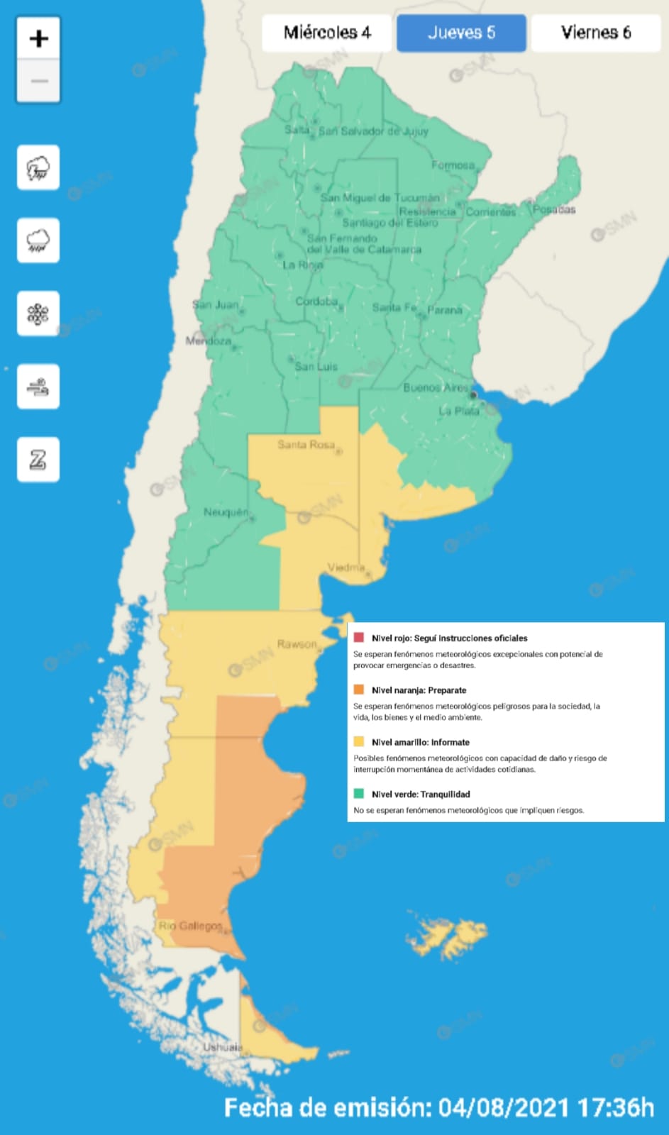 Así se desprende de la informacón emitida por el Servicio Meteorológico Nacional. La alerta por fuertes vientos abarca a las provincias de Santa Cruz, Chubut y Tierra del Fuego.