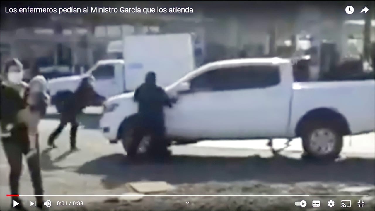 Cerca de las 18:00 horas, los enfermeros autoconvocados que se encuentran en una toma pacífica en el Ministerio de Salud y Ambiente de la provincia de Santa Cruz, habrían divisado salir al titular de la cartera por la puerta trasera, ante ello, quisieron hablar con él pero fue en vano, se subió a su camioneta y sin detener la marcha salió raudamente y en forma peligrosa.
