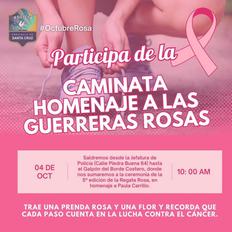 En el marco del mes de concientización sobre el cáncer de mama, la Policía de Santa Cruz invita a toda la comunidad a participar de la caminata en homenaje a las Guerreras Rosas del Viento.