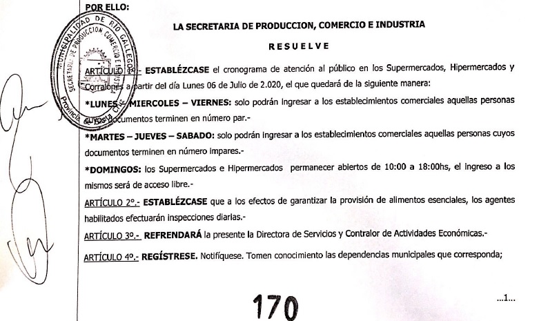 La Secretaría de Producción, Comercio e Industria, que encabeza Moira Lanesán Sancho, emitió hoy una resolución mediante la cual se busca reforzar la protección de la salud pública ante la confirmación de cuatro nuevos casos de coronavirus en Río Gallegos. Este instrumento legal establece que a partir del lunes 6 de julio volverá a regir el sistema de atención por terminación de DNI en supermercados, hipermercados y corralones.