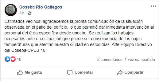 Ante esto los directivos tomaron conocimiento y han pedido intervención al área de mantenimiento del Consejo Provincial de Educación para que se tomen medidas rápidas ya que ante las temperaturas reinantes se ha hecho casi imposible el tránsito en la esquina del colegio. Una gran acumulación de agua se congeló produciendo inconvenientes a los transeúntes y automovilistas.