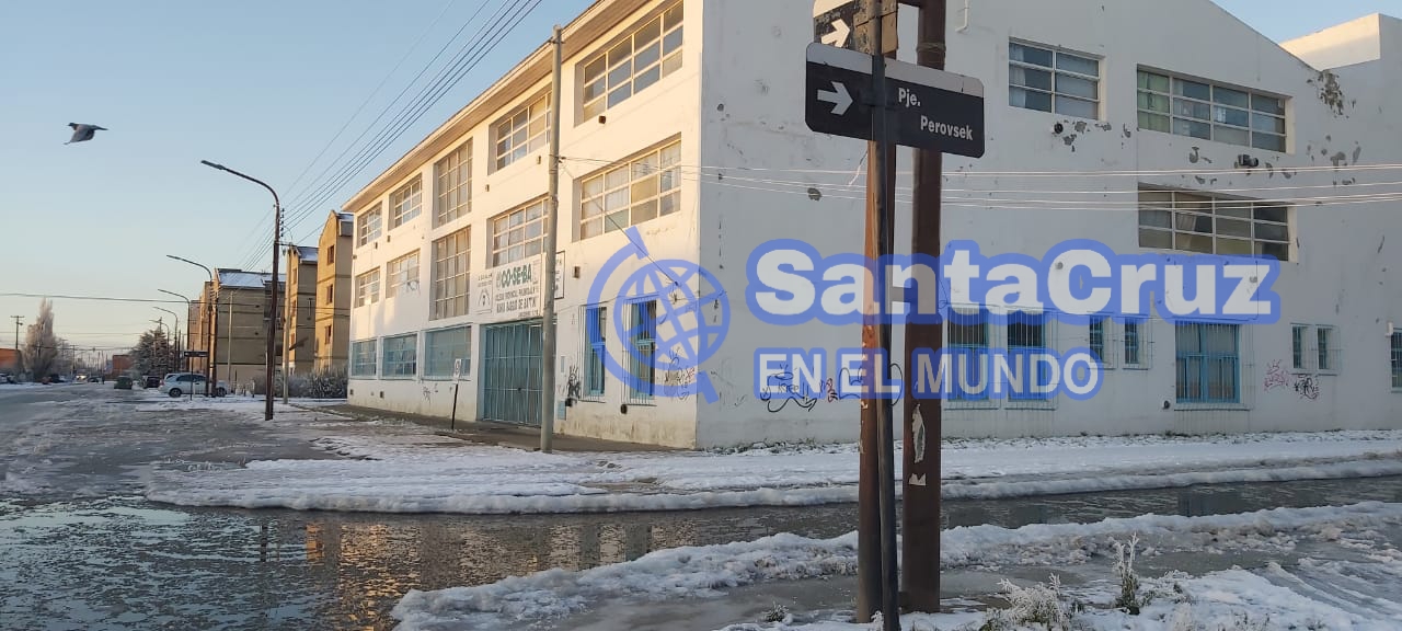 Desde hace unos días, vecinos del sector de los 400 Departamentos se fueron comunicando con los directivos del secundario Nº 16 sito en Ameghino 1218 ya que desde el establecimiento ha estado saliendo agua de una cañería del patio que produjo una gran acumulación en el Pasaje Perovsek y por las bajas temperaturas se congeló.