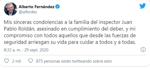 "Mis sinceras condolencias a la familia del inspector Juan Pablo Roldán, asesinado en cumplimiento del deber, y mi compromiso con todos aquellos que desde las fuerzas de seguridad arriesgan su vida para cuidar a todos y a todas", escribió Fernández en su cuenta de Twitter.