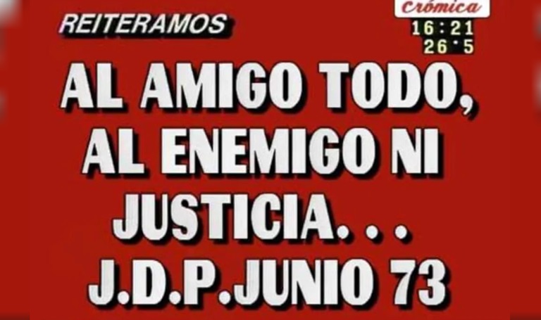 Y la segunda de las imágenes indicaba: "En la acción política, la escala de valores de todo peronista es la siguiente: Primero la patria, después el movimiento, luego los hombres".
