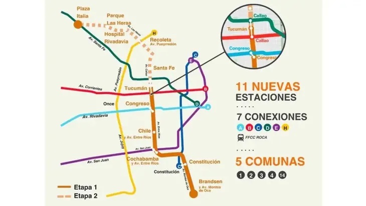 El recorrido del nuevo subterráneo - séptima traza de la Capital Federal- unirá las zonas sur y norte de la Ciudad ya que tendrá cabeceras en los barrios de Barracas y Palermo. En el trayecto conectará Constitución, San Cristóbal, Monserrat, San Nicolás y Recoleta por lo que destacan que permitirá la combinación con las seis líneas de subtes de la red.